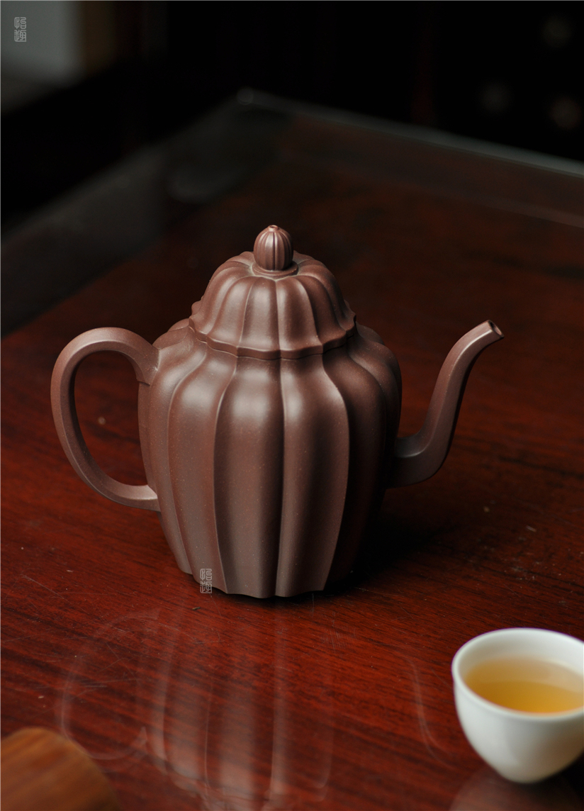 张老师仿殷尚摹古之作采用黄龙山上等老紫泥精心制成,泥色温润,质感极佳。壶盖与壶身均是由筋纹花瓣重合而成,含苞待放。壶身,壶盖,壶纽同样是六瓣菱花花瓣造型,筋纹沟壑凹凸有致,表现出筋纹特有的饱满与凝重之感,从而凸显出壶体之伟硕;颇具气势的大三弯流及耳形壶把均六方截面造型,与花瓣壶身相呼应,整体一气呵成,比例协调。