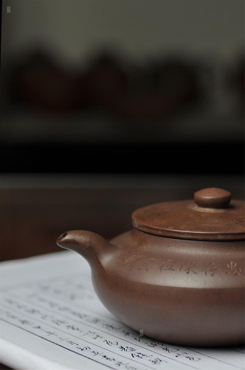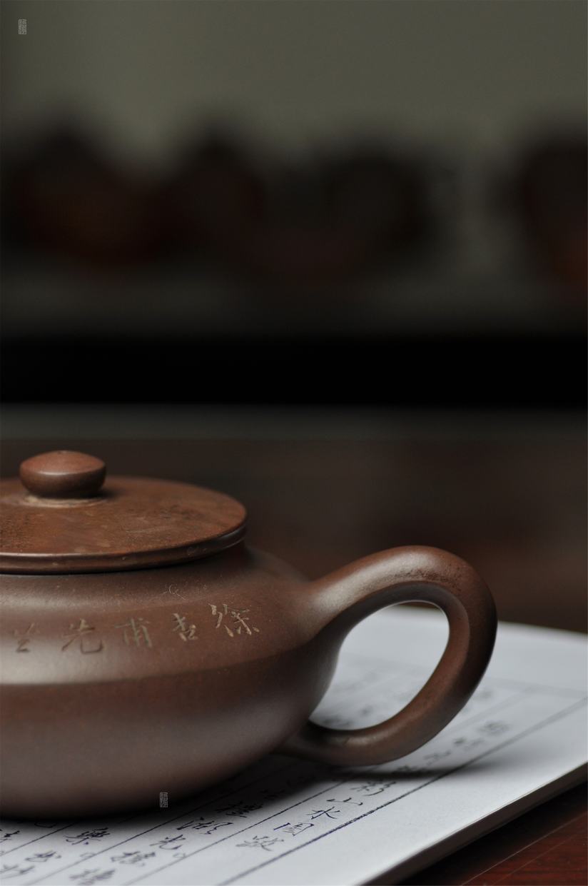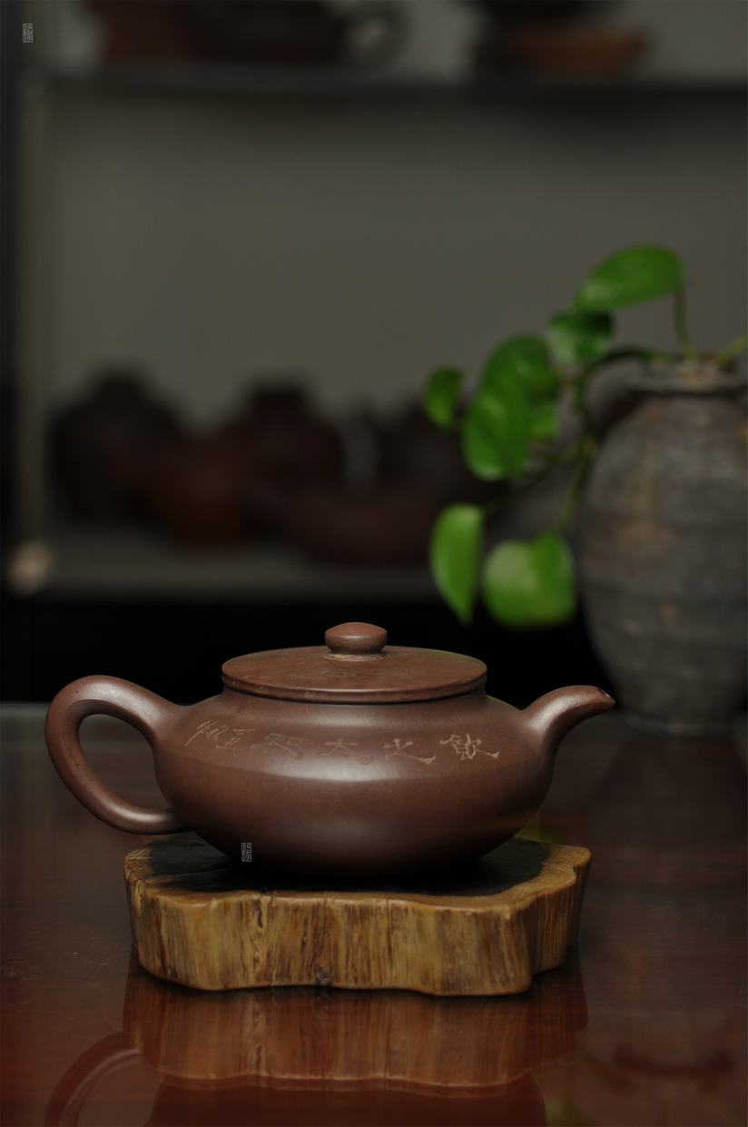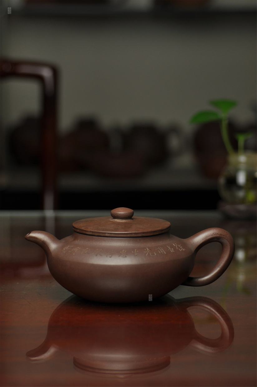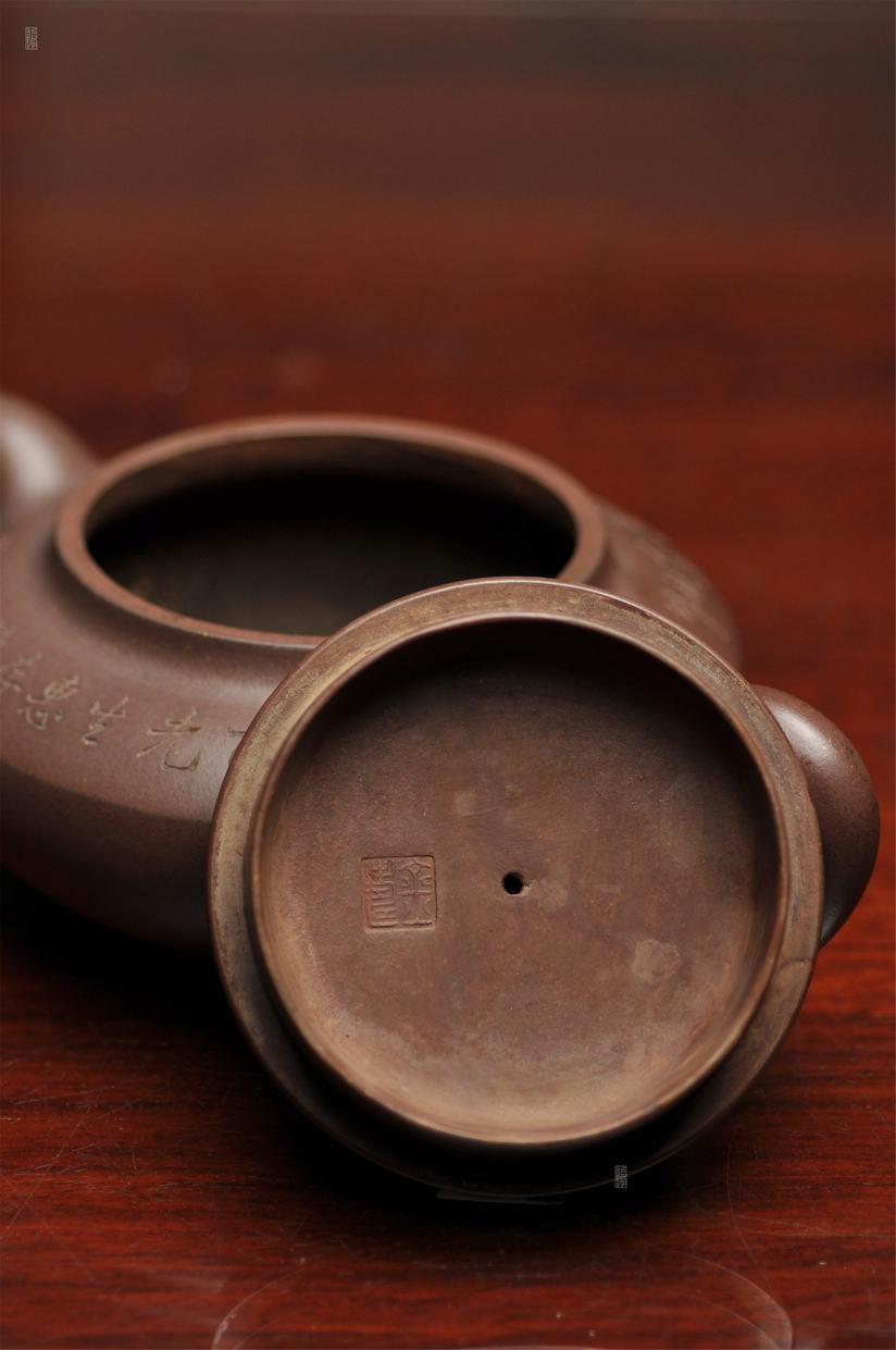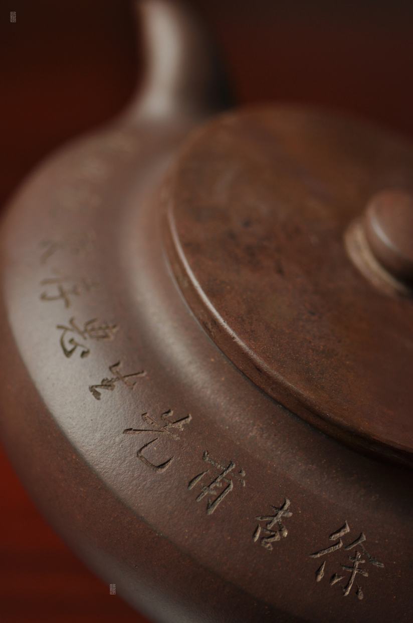壶身两侧刻绘刀法利落老辣,下刀深浅有度,笔画间的连带与顿挫皆具章法,笔墨意趣在紫砂胎体上展现得淋漓尽致,将文人书法的韵味与紫砂器的质感完美结合。