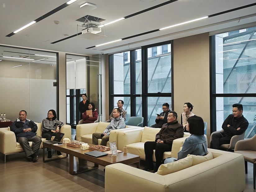 活动现场,暖光与绿植相映,投影幕上“紫砂文化雅集”的主题缓缓展开。