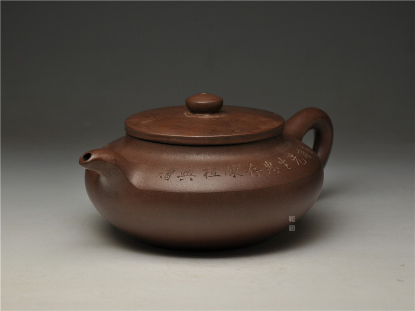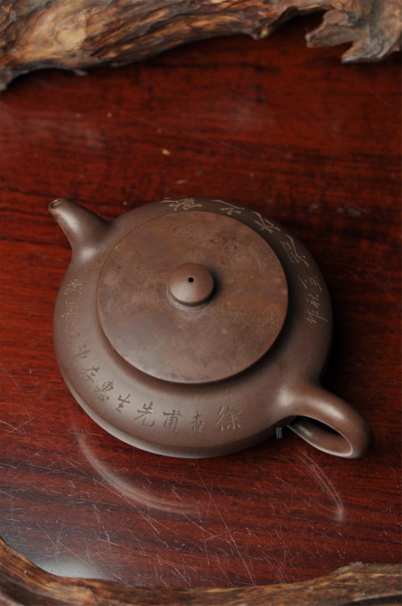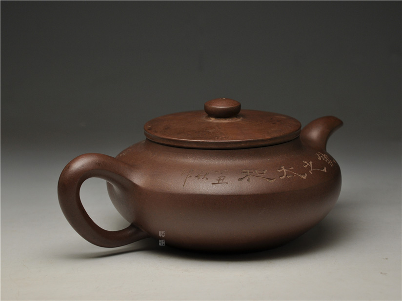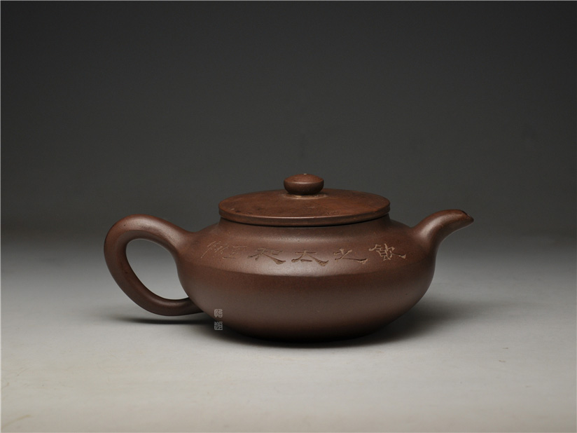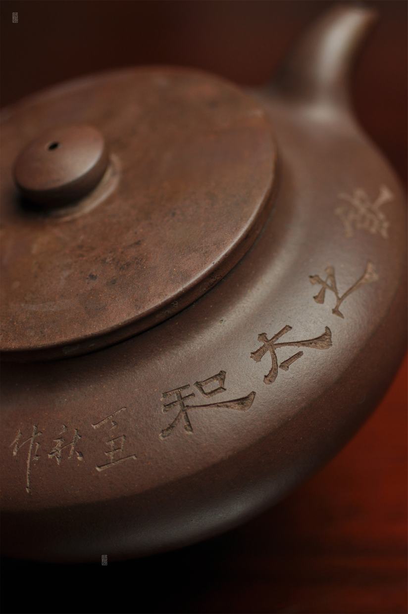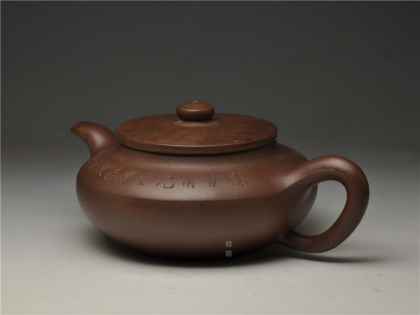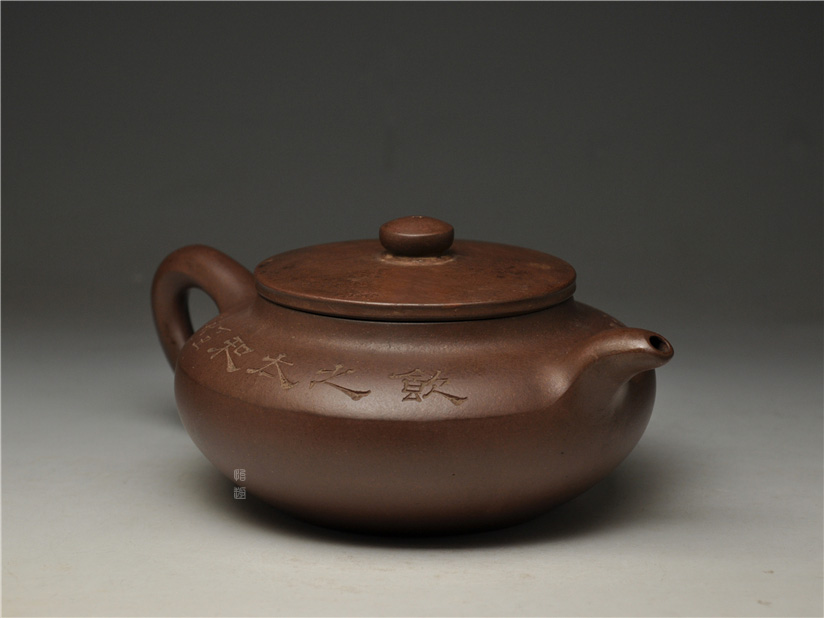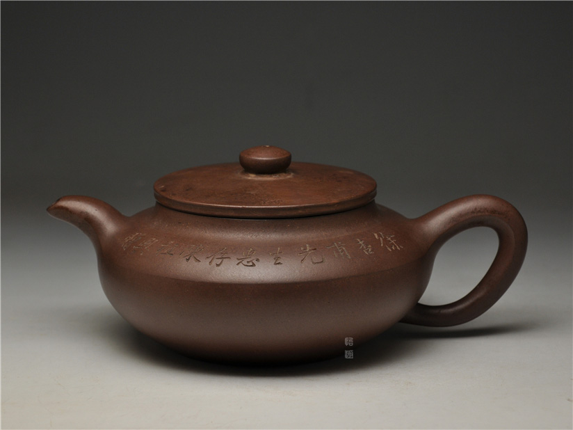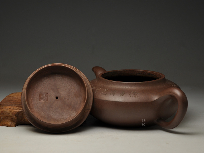 壶身两侧刻绘刀法利落老辣,下刀深浅有度,笔画间的连带与顿挫皆具章法,笔墨意趣在紫砂胎体上展现得淋漓尽致,将文人书法的韵味与紫砂器的质感完美结合。