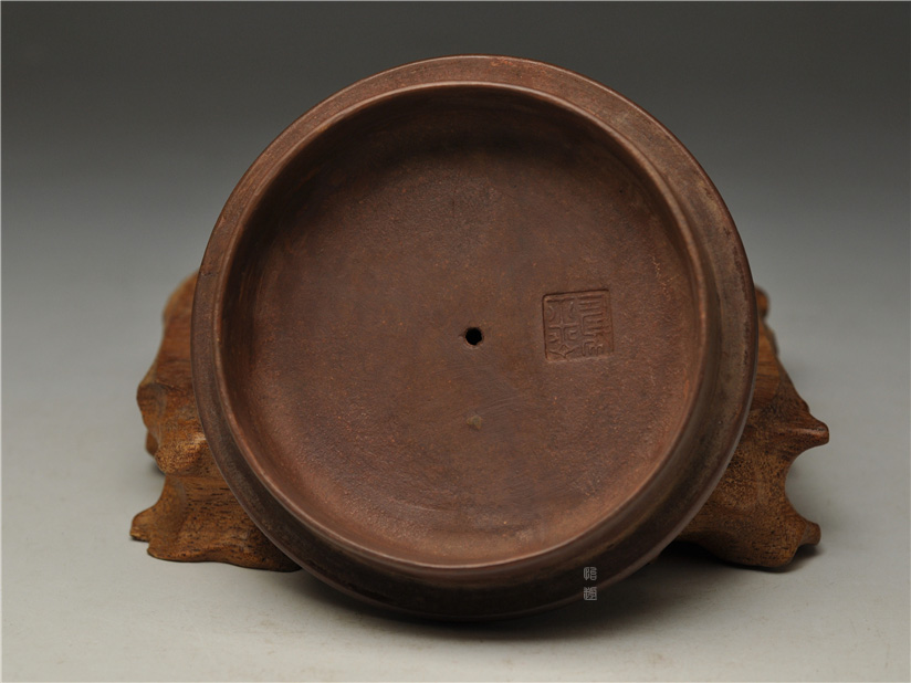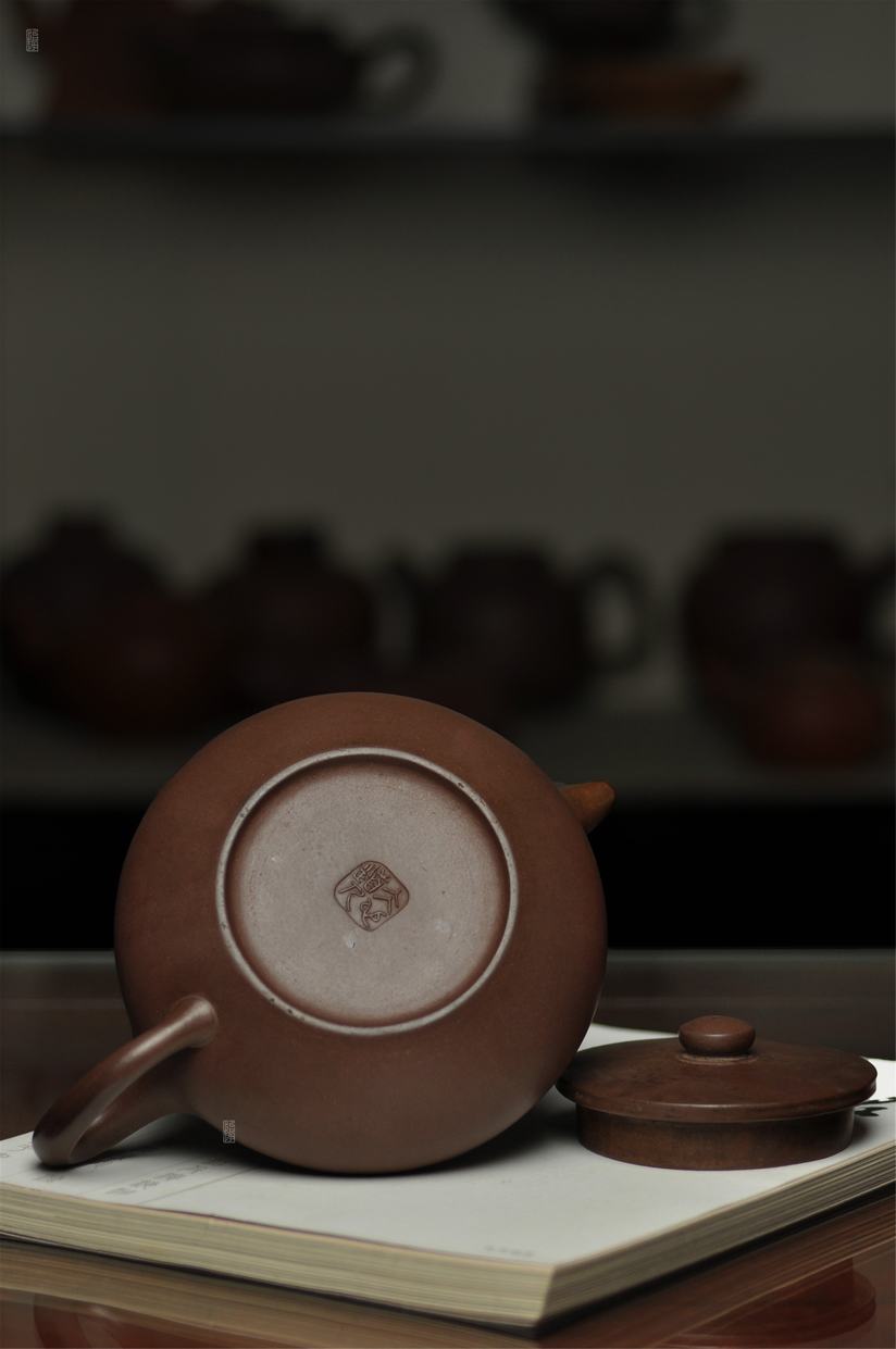 壶身整体呈扁圆形制,颈短内敛,壶口开阔大气,配平顶压盖,盖沿饰反弧线条,扁圆盖钮与壶身形成鲜明的大小对比,巧思尽显;腹、肩、口的线条转折刚劲,迸发出内敛的张力,平盖与壶口严丝合缝,稳稳托住器型风骨,毫无轻浮之感。壶流微曲胥出,大圈把向外舒展拉出,壶流侧肩与把侧的线条一气呵成,气贯全壶,二者遥相呼应,使器型更显生动自然。